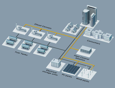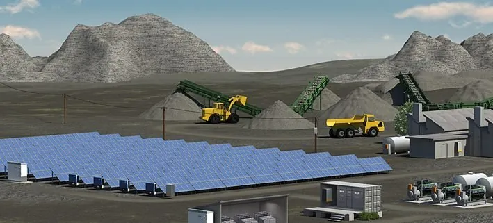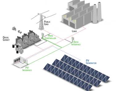 PV-diesel-hybrid-power plants without storage have rather low capital requirements. In the picture there is an option to connect the plant to the grid, which is applied in regions with an unstable grid. In the typical off-grid solution, the electricity from the solar power plant is used with priority, the diesel gensets generate the missing gap between the solar output and the load from the mine.