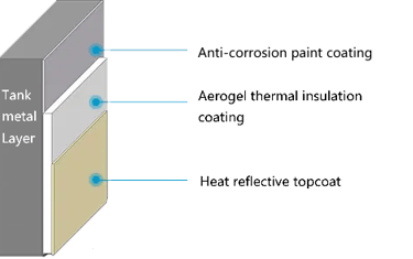 The aerogel thermal insulation coating with a thickness of 2mm after multiple spraying will reduce the temperature of the metal tank by 15℃ to 25℃, which can greatly reduce the safety management risks of oil and gas storage tanks and improve management efficiency.